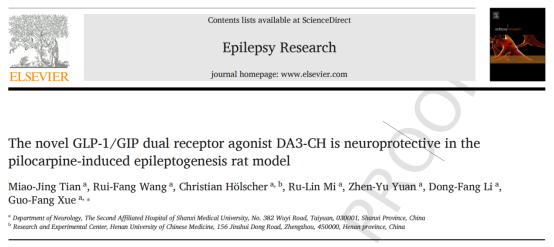薛国芳课题组首次观察到新型GLP-1/GIP双受体激动剂DA3-CH具有抑制癫痫发生的神经保护作用,研究成果“The novel GLP-1/GIP dual receptor agonist DA3-CH is neuroprotective in the pilocarpine-induced epileptogenesis rat model”于2019年5月7日收录于《Epilepsy Research》(图1)。