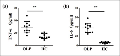 免疫组织化学结果显示MASPIN和IKKα在OLP组织中均呈阳性表达。其中MASPIN主要定位在OLP上皮层的胞质中。虽然IKKα在HC组织中不表达,但IKKα表达于OLP病损上皮层,细胞质亦是IKKα主要的定位部位(图1a),Real-time PCR实验结果表明,同HC组相比,MASPIN在OLP组中低表达,而IKKα在OLP组中高表达(图1b)。这些结果表明MASPIN和IKKα均参与了OLP的发病机制,且MASPIN和IKKα在OLP的炎症环境中可能是负相关关系。同时ELISA结果显示OLP组中TNF-α和IL-6的水平显著升高(图2)。