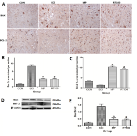 上图:芦丁可以显著下调SCI后脊髓损伤部位Bax基因表达,上调Bcl-2基因表达,减轻损伤后神经细胞凋亡
