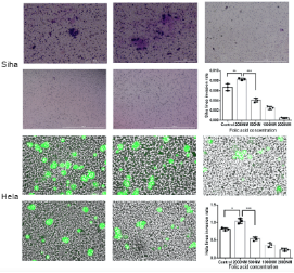 选取不同浓度叶酸 (0、 200、 500、1000、2000nM)连续处理48h,检测叶酸对于细胞增殖、迁移、侵袭能力。作用48h后,低浓度叶酸作用于Hela和Siha细胞在增殖、迁移、侵袭细胞功能学实验后,细胞数目较高浓度叶酸作用于宫颈癌细胞出现的细胞数目明显增加。实验证明通过不同浓度叶酸诱导宫颈癌细胞实验中,高浓度叶酸明显限制了细胞的增殖、迁移、侵袭能力。