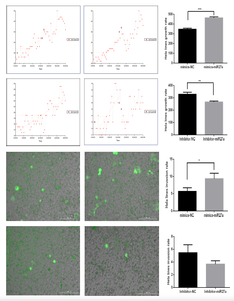 为了进一步确认miR-27a-3p是否对宫颈癌细胞增殖侵袭有明显的作用,运用质粒转染诱导miR-27a-3p的表达量上调和下调:提示宫颈癌细胞Hela经过RNA转染后inhibitor组48小时后数目较对照组明显减少。细胞侵袭率显著下降;mimics组48小时后数目较对照组明显增加,细胞侵袭率显著增加。