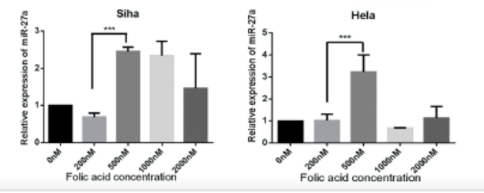选取不同浓度叶酸连续处理48h,提取宫颈癌细胞的microRNA,利用荧光定量PCR测量miR-27a-3p的表达情况。提示高浓度叶酸作用于宫颈癌细胞在miR-27a-3p表达情况明显低于低浓度叶酸作用于宫颈癌细胞miR-27a-3p的表达。