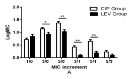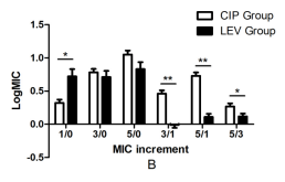 **: There is statistical difference between CIP group and LEV group for the same MIC increment and the same drug (P<0.001).
