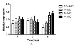 该研究中的细菌诱导以后外排泵未高表达,也就是说诱导以后细菌产生耐药的机制不是由于外排泵高表达。不同浓度(0.5×MIC,1×MIC,2×MIC和4×MIC)的环丙沙星诱导5天后,菌株外排泵的表达量结果见图2。