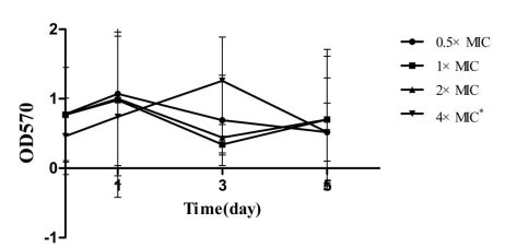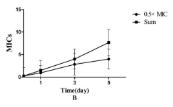 B:亚抑菌浓度(0.5×MIC)和MSW内浓度(1×MIC、2×MIC、4×MIC)下,MIC值的变化趋势。