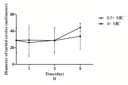 结果表明,在亚抑菌浓度(0.5×MIC)下(图1A),随时间的延长,铜绿假单胞菌对CIP的MIC呈上升趋势(P=0.001)。与亚抑菌浓度(0.5×MIC)相比(图1b),第5天MSW内浓度(1×MIC、2×MIC、4×MIC)能更明显的促进MIC值的增加(P<0.05)。