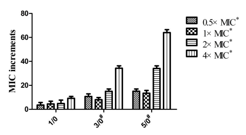 1/0, 3/0, 5/0:在第1、3、5天的MIC值除以原始MIC值,表示第1、3、5天MIC值的增量。