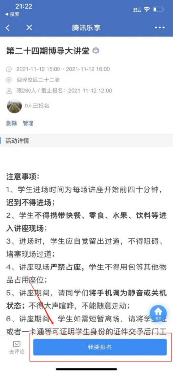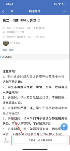 1、线上报名:同学们可使用“企业微信”手机端或PC端进行预约报名,须显示“已报名”方为报名成功;