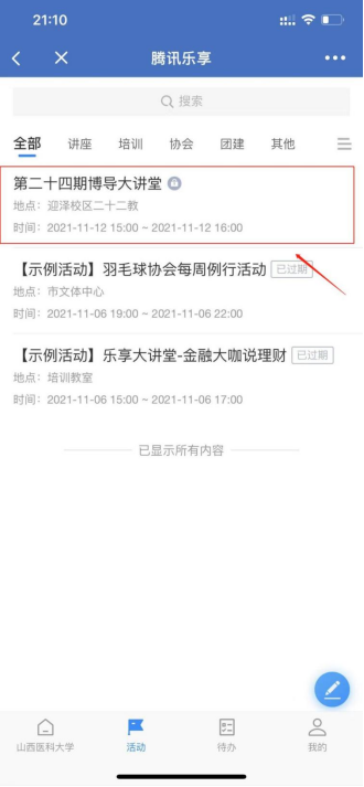 同学们到达讲座现场后,须使用手机打开企业微信,在“活动预约”中找到“我的——我的活动——我参与的”,出示“已报名”界面,待工作人员确认后方可进场。