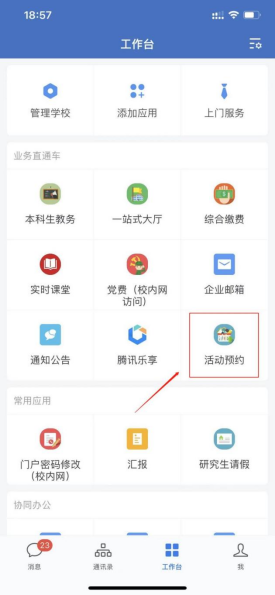 2、在“企业微信”预约报名成功的同学进场前需向现场工作人员出示讲座“报名成功”的界面(出示的界面由以下步骤获取:企业微信“工作台——活动预约——我的——我的活动——我参与的”),进场后扫描二维码签到。