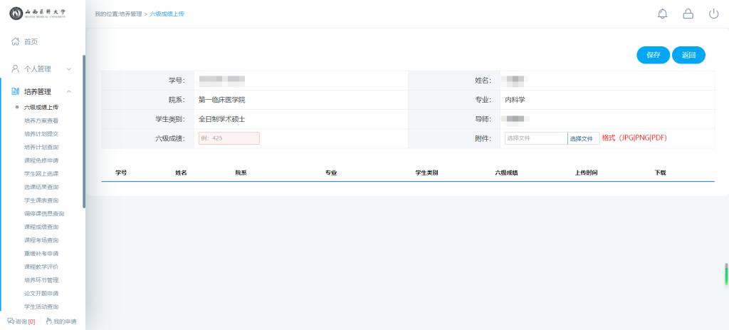 第四步:点击“研究生教务”后进入学生端教务系统,进入系统后,须按提示操作注册学籍,完善个人信息,然后点击培养管理—六级成绩上传,在该界面下如实填写六级成绩,然后通过附件上传六级证扫描件,具体要求如下:(1)请提交六级成绩大于390分(含390分)的最高一次成绩,低于390分者无需提交;(2)如六级证原件丢失,可提交原学校教务处出具的有效证明和国家四、六级考试中心出具的成绩证明等;(3)如原学校暂未下发六级成绩单,请提供成绩查询的截屏或带二维码的电子成绩单,如下图: