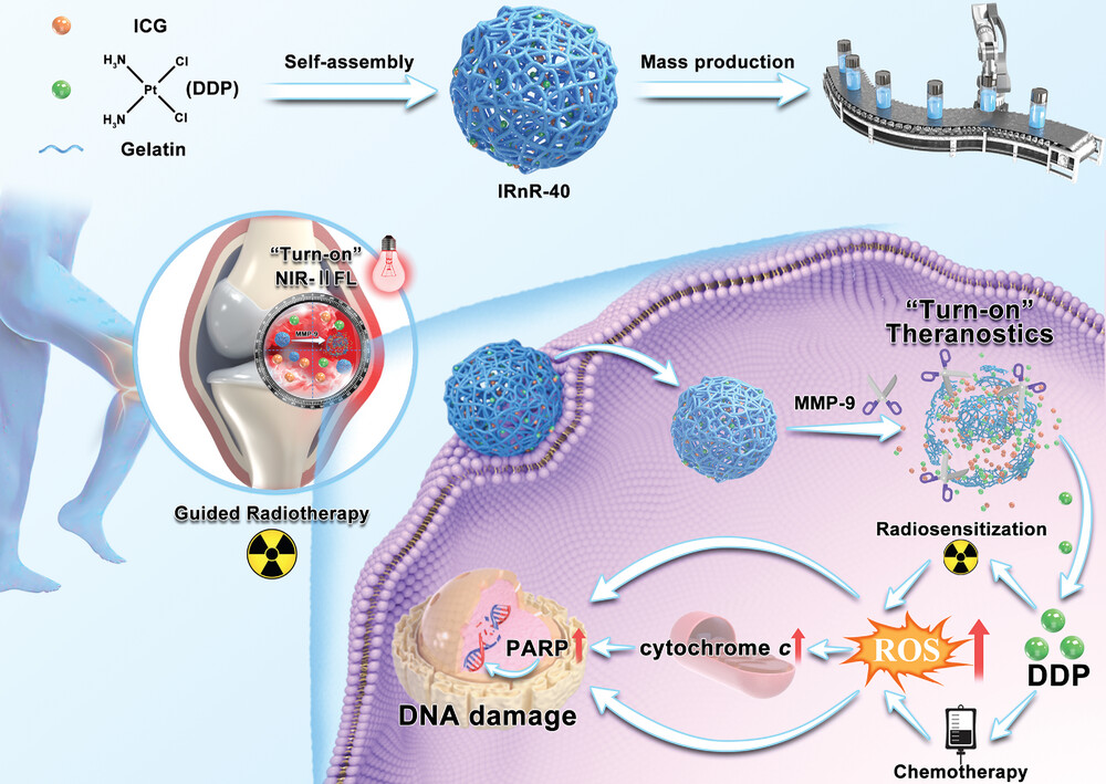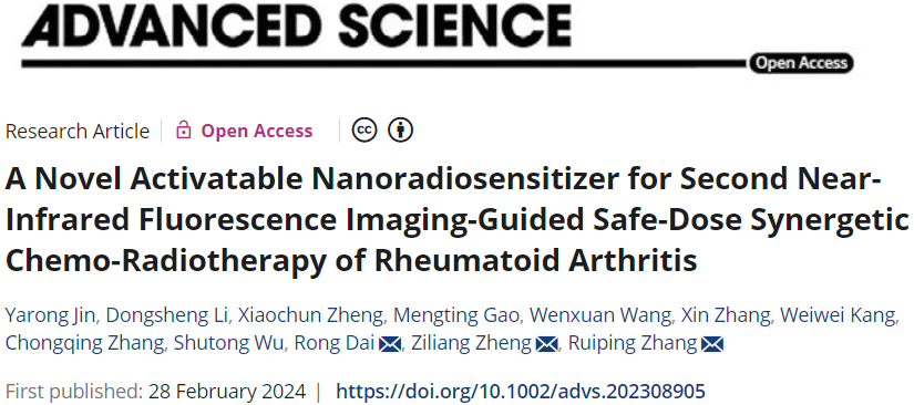 2024年2月28日,万象城allwincity官网张瑞平、Zheng Ziliang、Dai Rong共同通讯在Advanced Science在线发表题为“A Novel Activatable Nanoradiosensitizer for Second Near-Infrared Fluorescence Imaging-Guided Safe-Dose Synergetic Chemo-Radiotherapy of Rheumatoid Arthritis”的研究论文,该研究将临床批准的药物顺铂(DDP)和吲哚菁绿(ICG)封装在明胶壳内,开发了一种新型可激活纳米放射增敏剂-40(IRnR-40),实现了第二近红外光(NIR-IIFL)成像引导的安全剂量协同化疗。