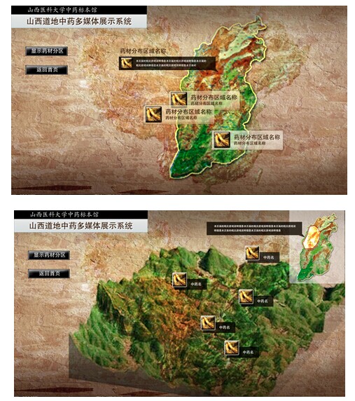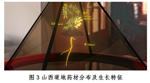 模拟演示请点击:山西道地中药系统、黄芪生长动态模拟 中药资源与药材生产模块针对全国九大药材分布生产地和山西道地药材分布通过数字沙盘投影模式进行形象、直观地呈现;同时,对山西道地药材黄芪、连翘和党参的生长特征进行幻影悬浮成像技术仿真模拟呈现,逼真地体现山西道地药材的生长过程和药材特性。目前已开设有(1)中国中药资源分布及野生中药资源保护、(2)山西道地药材特征及真伪鉴别两项开放性实验项目,作为药用植物学、中药鉴定学、中药商品学、中药学等课程实验教学的重要内容,达到了很好的教学效果。见图1、图2、图3。