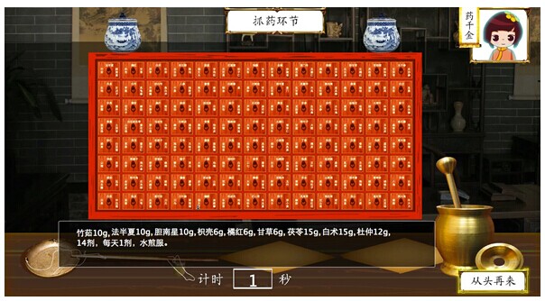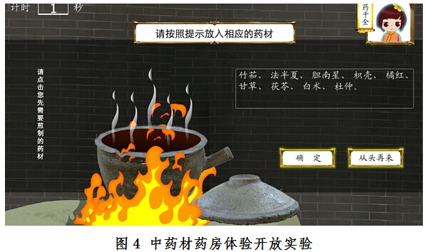 模拟演示请点击:人体经络、阴阳五行、中药房游戏 数字中医药模块主要分为人体经络、阴阳五行、模拟药房三个主要模拟系统。人体经络系统通过数字动画模拟真实人体经络走行,直观展示经络的走行及与疾病的相关性;阴阳五行系统采用动画形式形象展示中医气血阴阳和五脏六腑等经典中医理论,达到对中医学理论的深入展示;模拟药房设计成游戏形式,利用多媒体模拟仿真系统通过模拟真实药房场景,使学生在实验室就能身临其境体验中药房抓药、药材查询、煎药等过程。依托数字中医药模块,中心目前开展的主要模拟仿真实验项目有人体主要经络走行模拟实验、阴阳五行相生相克模拟实验及400种中药材的药房体验共三项开放实验,作为中医基础理论、中药学、中药方剂学等课程实验教学的重要内容,深受学生好评。见图1、2、3、4。