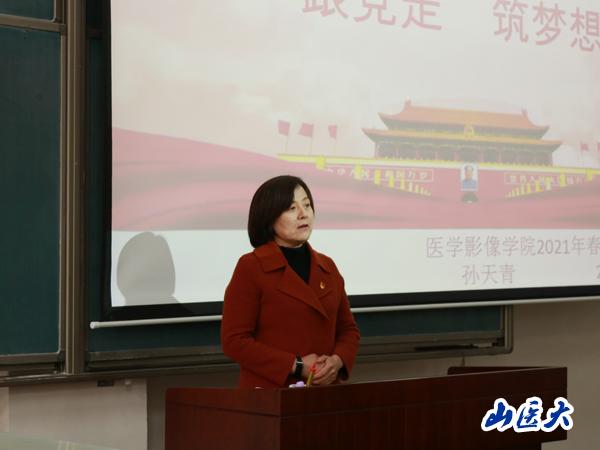 为全面贯彻落实习近平总书记在全国党史学习教育动员大会上的重要讲话精神,根据校党委统一安排,3月8日下午,医学影像学院党总支书记孙天青以“学党史、悟思想,跟党走、筑梦想”为题,为2019级医学影像技术专业全体学生上了一堂生动的“开学第一课”。学院党总支副书记郭晔及全体思想政治辅导员参加。