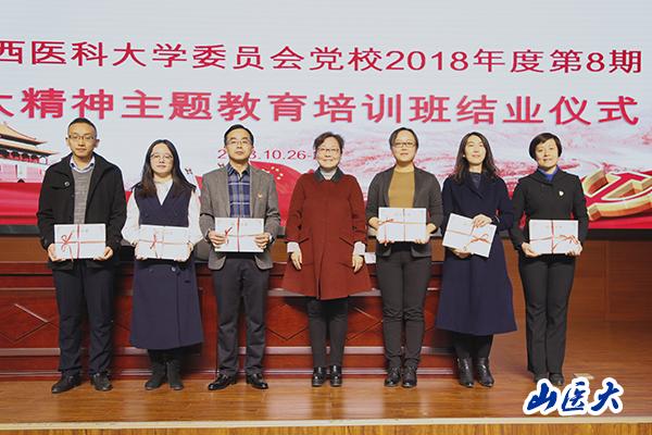 10月26日至28日,学校党校2018年度第8期党的十九大精神主题教育培训班在中都校区教学办公楼一层学术报告厅成功举办。培训班通过专题教学、视频教学、学习心得交流、自学相结合的方式深入学习了党的十九大精神、习近平新时代中国特色社会主义思想、《中国共产党章程》、《中国共产党纪律处分条例》、全国教育大会精神,并且进行了意识形态专题教育、先进典型教育和警示教育等。28日下午,培训班圆满结业,来自学校各单位各部门的290名学员完成培训,校党委副书记贺培凤主持结业式。