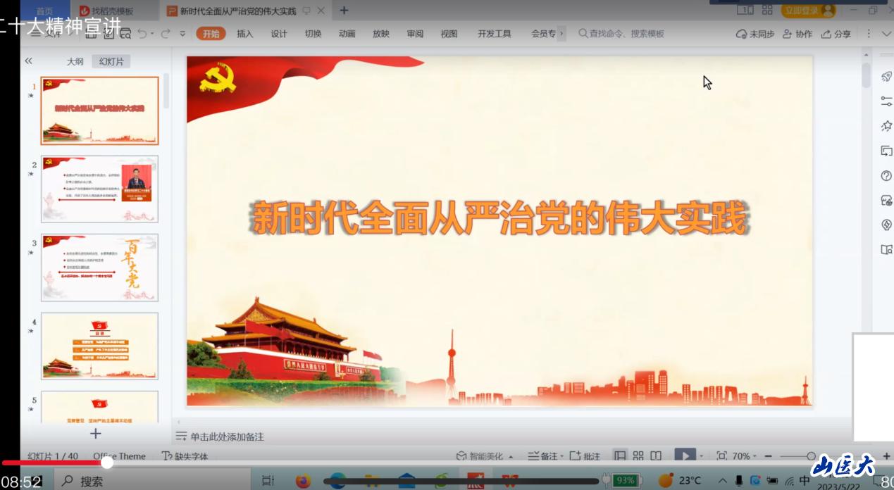 会议邀请到学校党的二十大精神宣讲团成员、马克思主义学院教师宋禄华,为全体与会人员专题宣讲《新时代全面从严治党的伟大实践》;宋老师从党要管党,坚持严的主基调不动摇;全面从严治党,产生了全方位深层次影响;坚持不懈,全面从严治党向纵深推进三个部分进行了详细阐述,教育引导各级党组织和广大党员、干部不断增强党的自我净化、自我完善、自我革新、自我提高能力,始终成为中国特色社会主义事业的坚强领导核心。